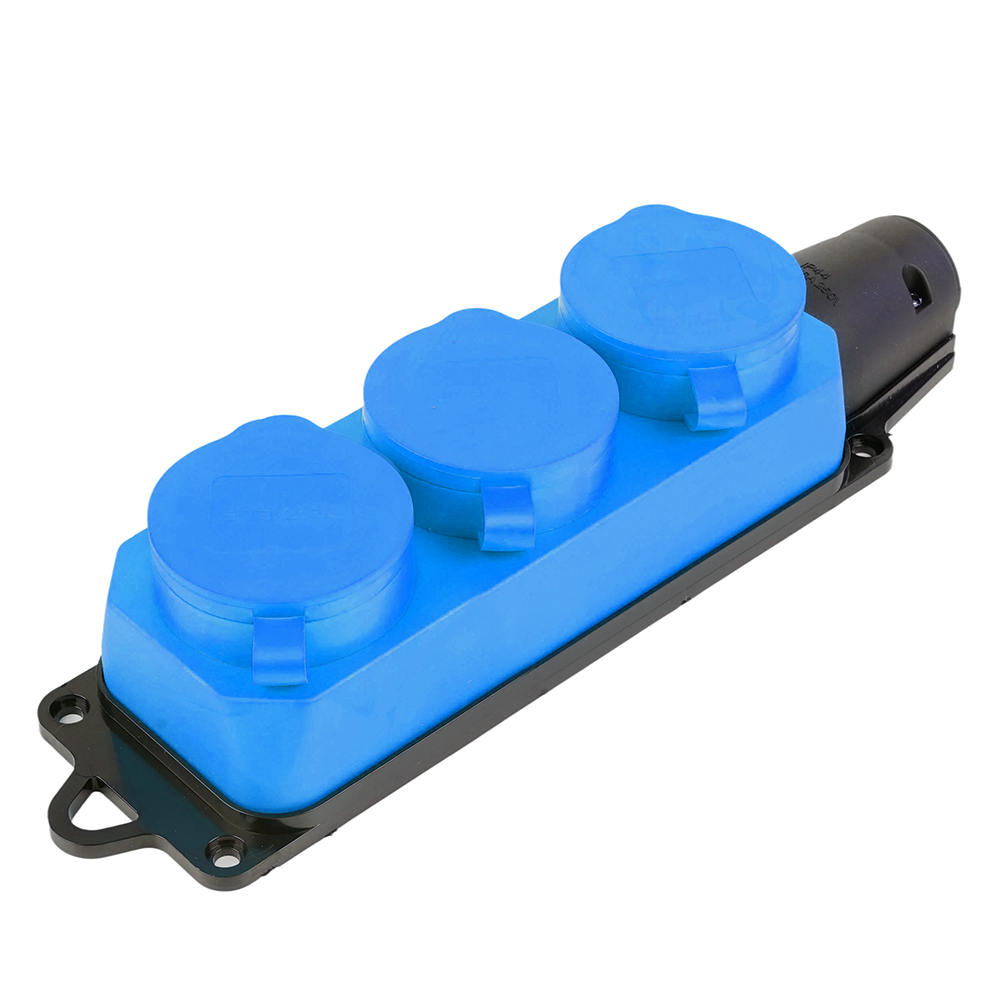 Розетка STEKKER RST16-23-44-4 на 3 гнездо, с крышкой, с заземлением. Материал: каучук, цвет синий, размер 197*66*51мм. Номинальное напряжение 250, номинальный ток 16А, диапазон рабочих температур 0..+35°C, IP44
